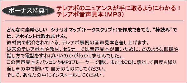 | 特典1 | テレアポ音声見本(音声データでのお渡しとなります) |