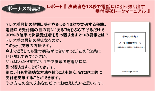 | 特典3 | レポート 『決裁者を15秒で電話口に引っ張り出す受付突破トークマニュアル』 |