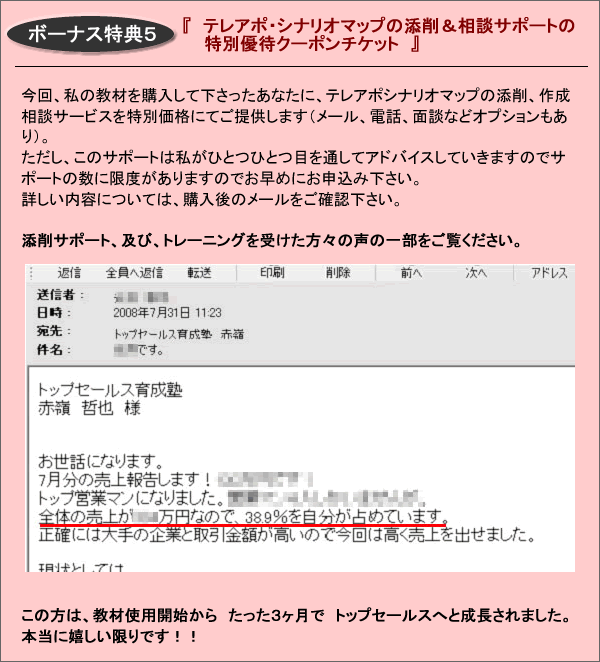 | 特典5 | テレアポ・シナリオマップの添削サポートの特別優待クーポン |