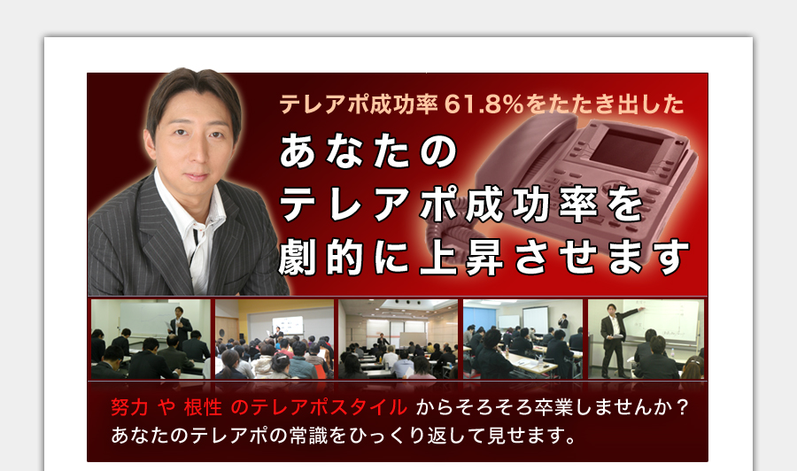 | この教材 を読み終えた瞬間に、テレアポが取れるようになったり、営業力がアップしたりすることは決してありません。ペンを持って、脳みそに汗をかいて教材に書いてあることを実践した人 が最大の恩恵を受け取れるようになっているノウハウなのです。 ただし、現在世に出ているテレアポノウハウの中で、最も実践的で結果の出るノウハウであることをあなたにお約束いたします。 |